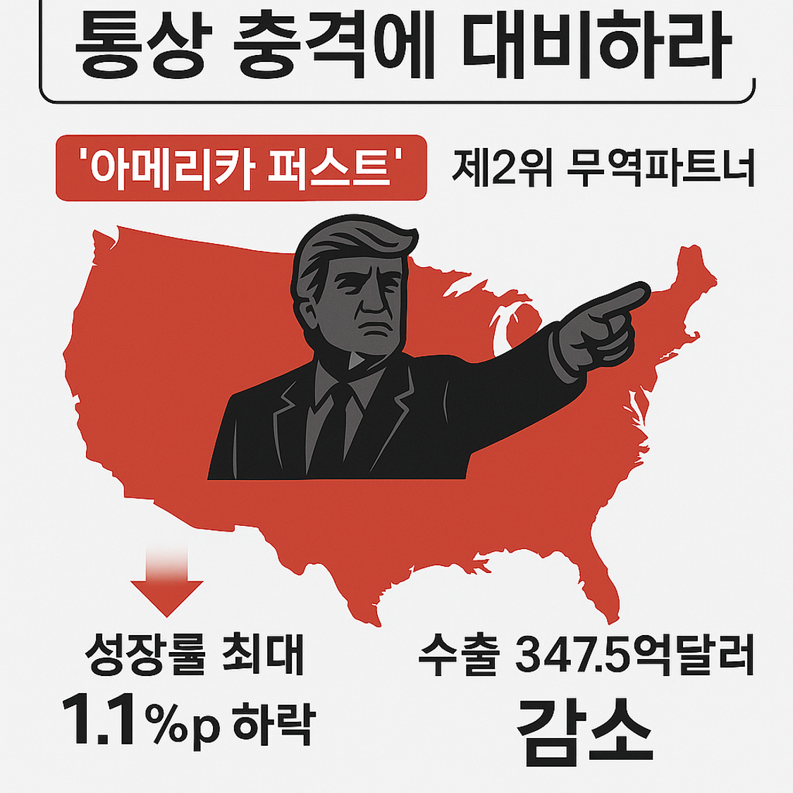 한국 경제 성장률은 최대 1.1%p 하락, 수출은 347.5억 달러 감소할 수 있다는 전망도 있었습니다. .