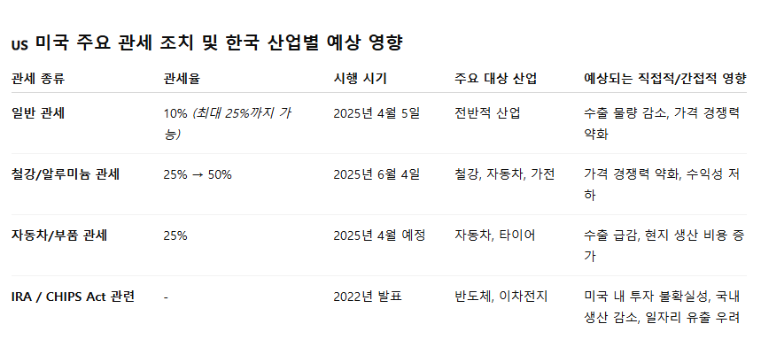 특히 그 중 가장 이슈가 되고 있는 점은 철강(6월 4일 기준, 25%->50%)과 자동차(4월 기준 25%)에 대한 관세는 한국 수출 산업에는 너무 큰 치명타가 되고 있습니다.
